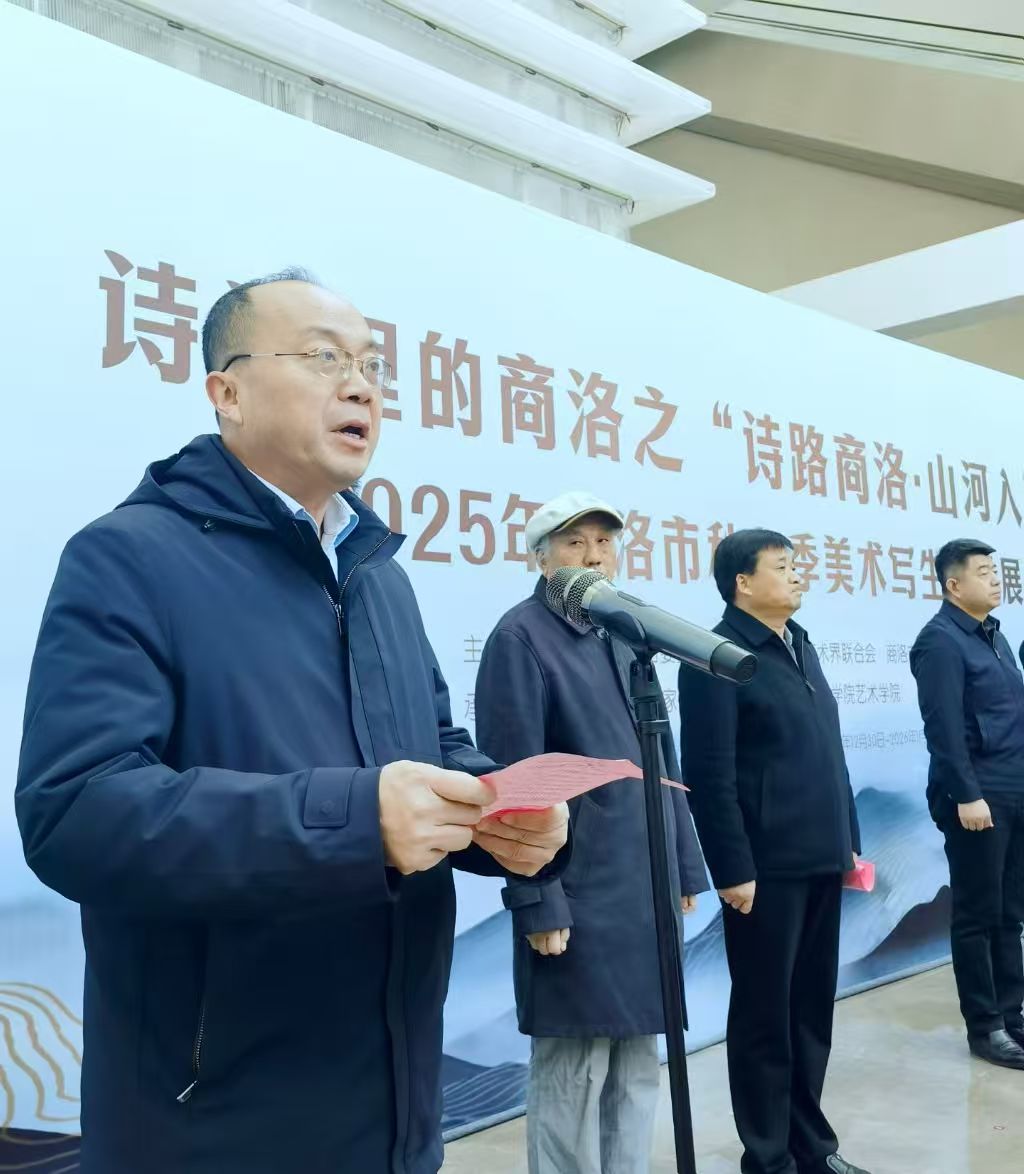 开幕式由商洛市文联党组书记、主席李明权主持。中共商洛市委常委、宣传部部长贾永安首先致辞,对展览的举办表示热烈祝贺,并充分肯定了美术写生活动在推动地方文化繁荣与艺术教育融合中的积极作用。随后,参展画家代表、我院教师、中国美术家协会会员袁志正教授发言,分享了深入秦岭腹地开展写生创作的感悟与收获。最后,商洛市文化和旅游局局长巩文超致辞并宣布展览正式开幕。