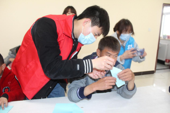 第一个环节是“折纸飞机,放飞梦想”,蓝色是海洋的颜色,同时也象征着社会对自闭症患者的“爱与包容”,“慧灵”的老师准备了蓝色折纸,志愿者们将自己制作纸飞机的方法手把手教给他们,并在纸飞机上写下了对他们的祝福。