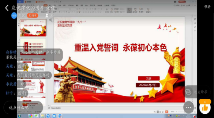 为庆祝建党99周年,重温党史,使广大党员普遍接受一次党性教育,6月27日,学生第二支部书记刘露为支部全体党员讲党课,在钉钉平台上线上直播进行,支部全体党员参加。