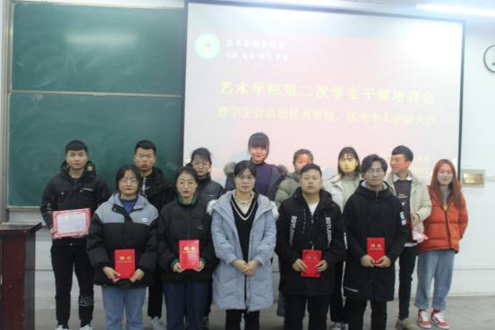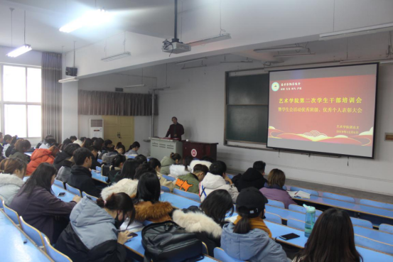 首先,院党总支书记黄新春老师就学生干部培训作了发言,黄书记从学生干部的职责分工、责任担当、工作方法、权力制约、团结协作等五个方面对大家进行一次具体而深入的教育培训,使与会学生干部对如何当好学生干部、如何管理和服务好学生、如何有效助力老师开展工作、如何带队伍抓好班级思想、学习、纪律、生活、活动等方面的工作有了更进一步的理解与认识;接着,辅导员张宗海老师重点结合大一班干部的工作实际,对各班班干部的班级日常管理方法提出多样化思路,并对院学生会今后工作提出了建议;然后,团总支书记任楠老师为学生会活动先进班集体和优秀个人颁发荣誉证书予以表彰,肯定了获奖同学本学期在学校学院活动中的优异表现。最后,任楠老师总结讲话,她强调学生干部应有服务意识、集体意识、主动意识,希望学生干部严格要求自己,带领好艺术学院学生会更好向前发展。