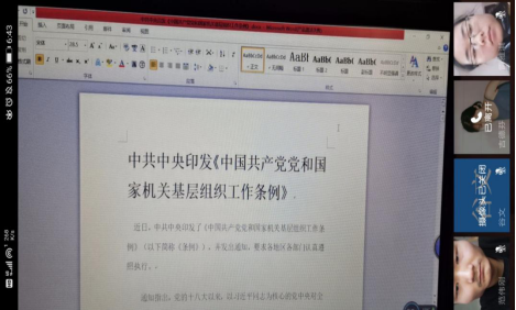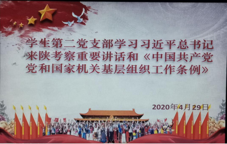 4月29日下午,学生第二党支部全体党员利用钉钉平台集体学习习近平总书记来陕考察重要讲话和《中国共产党党和国家机关基层组织工作条例》。