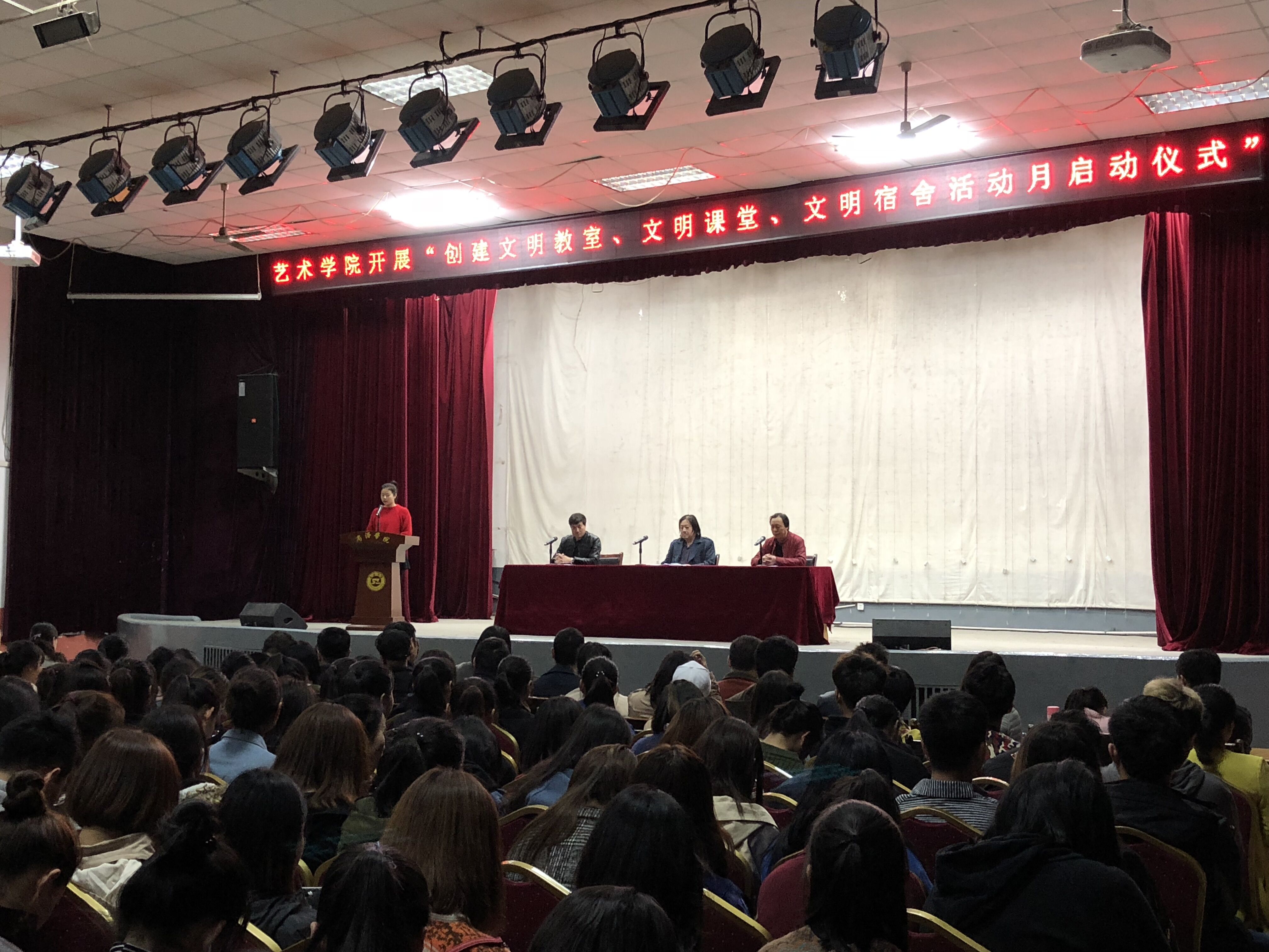 为提高我院学生“讲文明、树新风”意识,2018年3月12日晚七点半,艺术学院在大学生活动中心召开“文明教室、文明课堂、文明宿舍”活动启动仪式,参会人员有艺术学院院长刘凤林、李世鹏,党总支书记黄新春以及艺术学院全体师生。