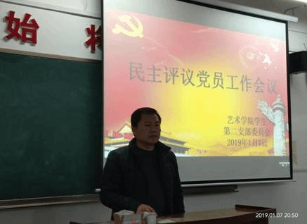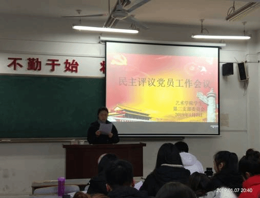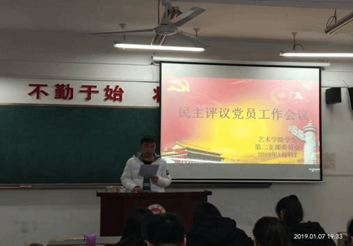 1月7日晚,学生第二党支部全体成员在1-605教室召开了民主评议党员工作会议,会议邀请了艺术学院党总支委员祁志华同志莅临指导工作。大会共有通报学习情况、党员自我评价,党员互评,领导点评和民主测评五个环节。